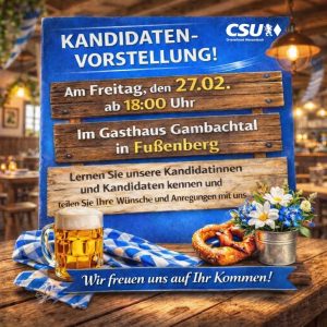 01.02.2026 – Vorstellung der CSU-Gemeinderatskandidatinnen und -kandidaten: Dienstag, 03.02.2026 im Gasthaus Gambachtal, Fußenberg